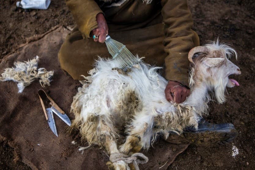 The collectors gather the wool from the goats underbelly, which provides the softest and warmest wool fibers, making it a popular textile in the fashion industry.