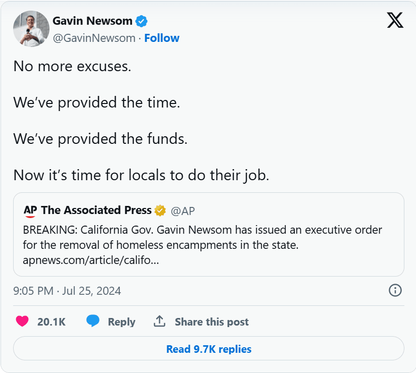 California Governor Gavin Newsom Initiates Clean-up of Homeless Camps, Faces Backlash