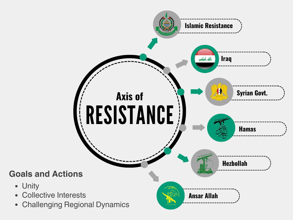 Notably, the members of the Axis of Resistance include Islamic Resistance in Iraq, Syrian Government, Hezbollah (Lebanese militant group), and Hamas (A Palestinian militant group) and other Palestinian groups.