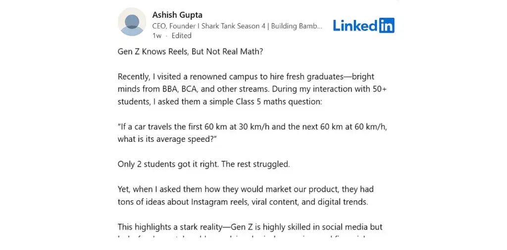 In a post titled “Gen Z Knows Reels, But Not Real Math?”, Gupta points to a very uncomfortable reality about a generation quick to create viral content but struggling with simple reasoning and real-world problem solving.