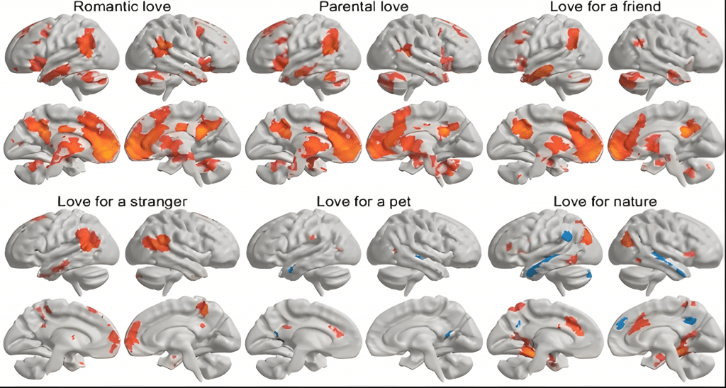 Aalto University conducted innovative research using Functional Magnetic Resonance Imaging (FMRI) to study how various kinds of love affect brain activity. Participants listened to scenarios about six types of love. These types include: